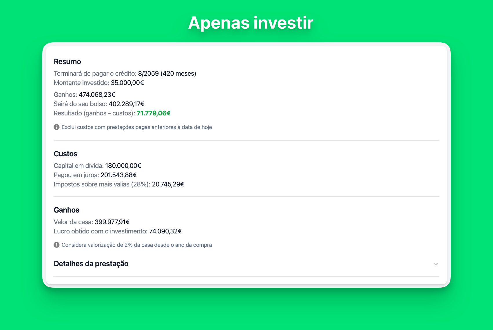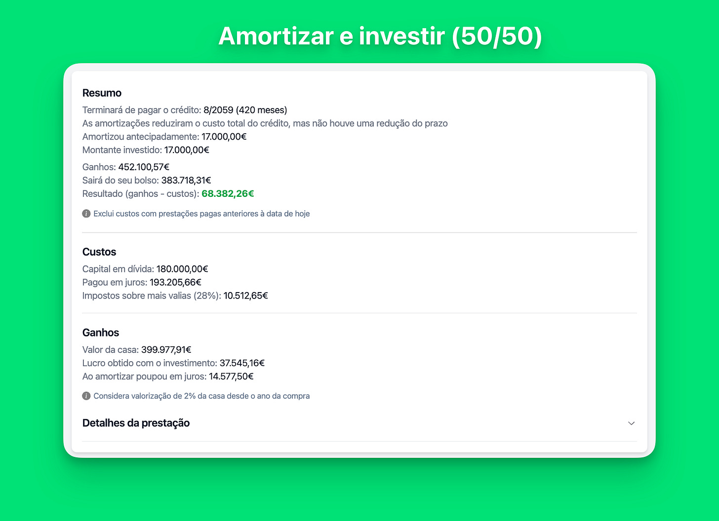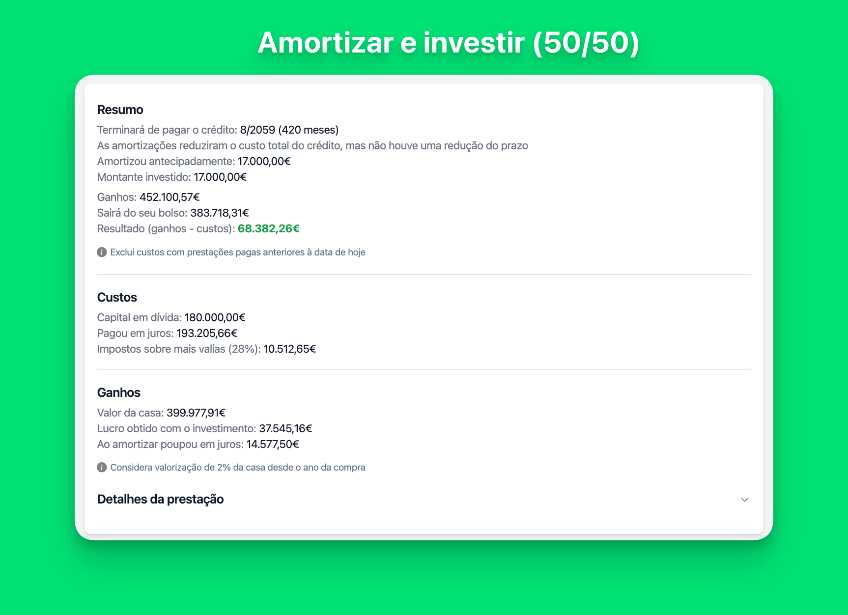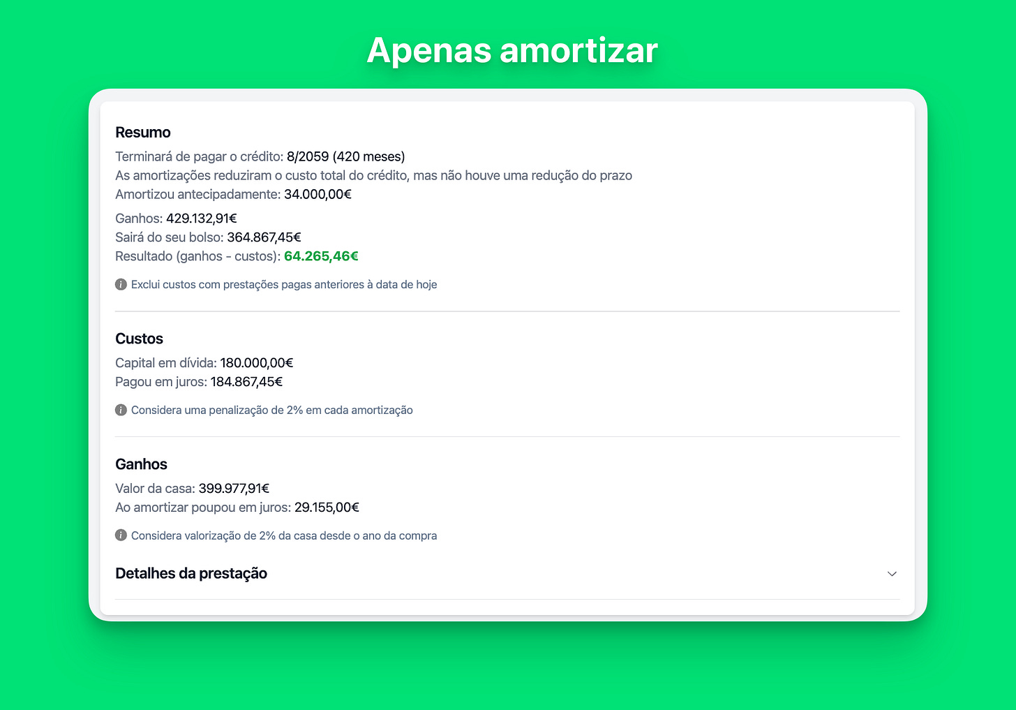 Nota: O pagamento mensal é recalculado após cada reembolso, onde podes consultar o impacto de cada um deles nos “Detalhes da prestação”.