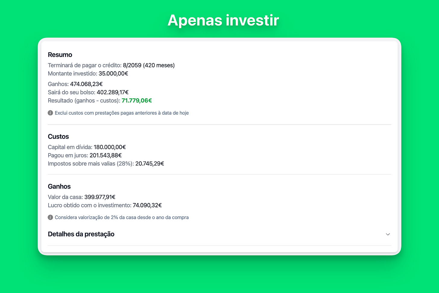 Apenas investir: +€72.000