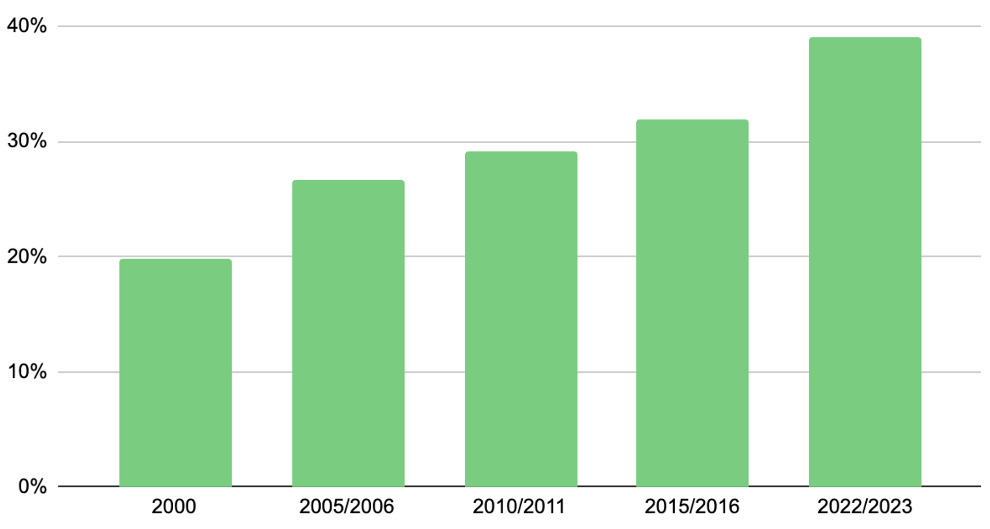 Os custos com a habitação levam a maior fatia dos nossos rendimentos, representando 39% das despesas familiares em 2022/2023. Se analisarmos a evolução histórica deste indicador, verificamos que praticamente duplicou ao longo das últimas duas décadas: