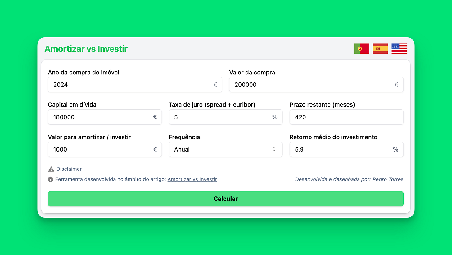 Nota: variando as condições na calculadora, especificamente o valor a amortizar/investir e a sua frequência, os resultados variam significativamente.