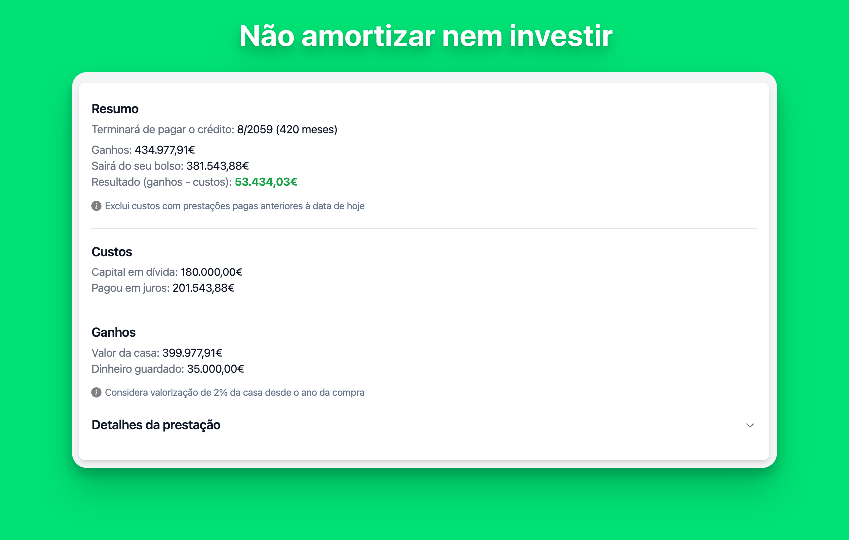 → Conseguimos guardar €35.000 (€1.000 por ano durante 35 anos), a casa valoriza até aos ~€400.000 mas gastamos mais de €380.000 a pagar o crédito habitação dessa mesma casa ao longo dos anos.