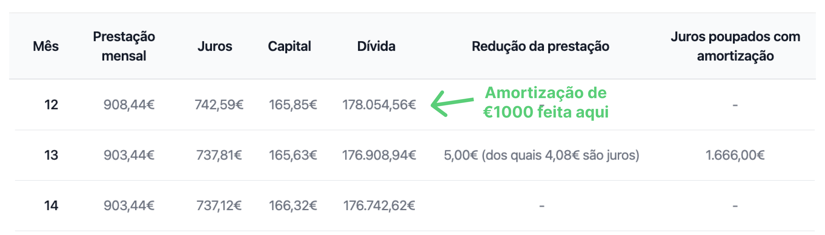 Nota: em Portugal, ao fazer uma amortização, o valor da prestação diminui conforme o novo montante em dívida, mas não há redução do prazo do crédito.