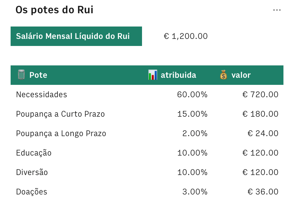 Tendo em conta que o Rui ganha cerca de 1.200 euros mensais, a distribuição do seu ordenado pelos diferentes potes é, regra geral, da seguinte forma: