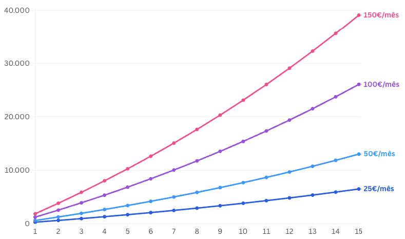 Investindo 100€/mês durante 15 anos a 4,5% ao ano, resultaria num montante acumulado de cerca de 25.644,71€, dos quais 18.100€ correspondem a capital investido, e o restante resulta do rendimento gerado pelo investimento.