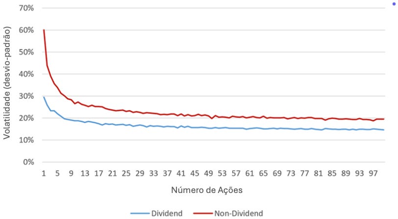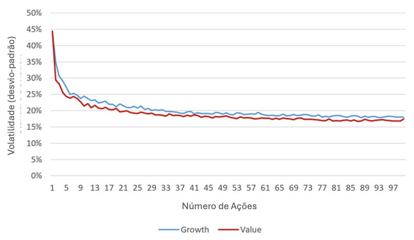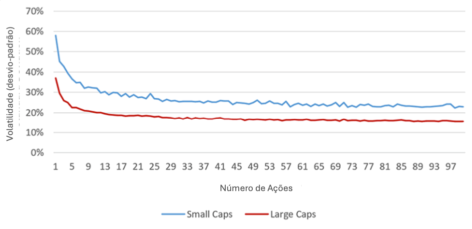 A redução da volatilidade foi mais visível até cerca de 30 ações; a partir desse ponto, o impacto da diversificação foi reduzido.