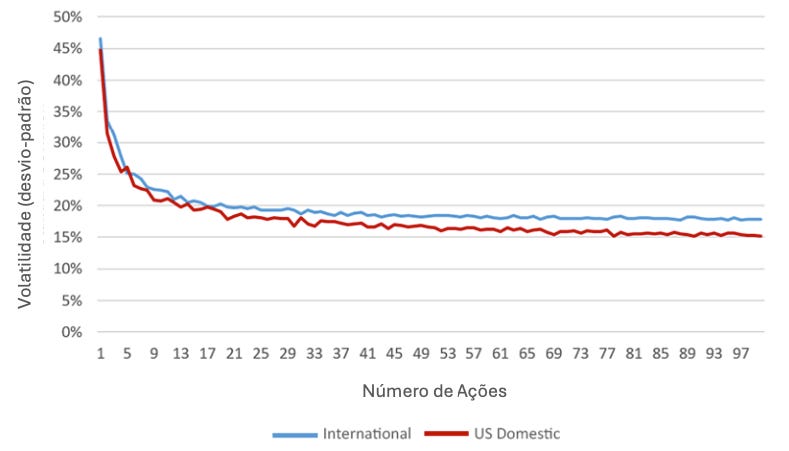 Nas carteiras internacionais e de empresas americanas, a diversificação trouxe benefícios semelhantes, onde o maior benefício sentiu-se até às 25 ações.