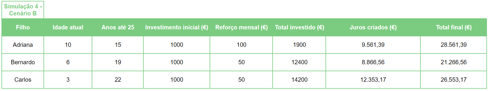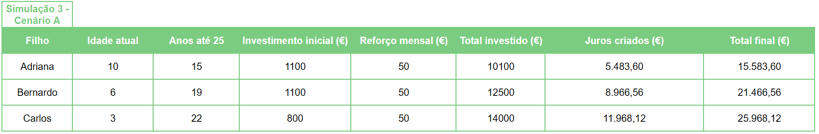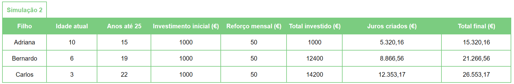 Mas a regra de ouro está inquebrável. Quanto mais cedo começar, mesmo com um reforço mensal sempre igual, maior será o “pé-de-meia” para cada filho quando chegar aos 25 anos.