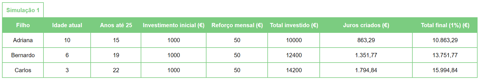 Para este cenário, os pais começam com 3.000€ (1.000€ para cada filho) e o reforço mensal é de 150€ (50€ para cada filho) e rentabilidade de 1% ao ano.